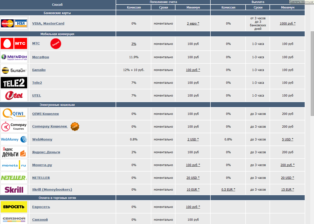 Также пополнить счет в своем личном кабинете Вы можете используя терминалы самообслуживания, мобильным переводом, банковскими карточками (Visa, MasterCard). Очень часто игроки практикуют пополнение через WebMoney, банкинг, Монета, Яндекс деньги и с других электронных кошельков. Размер минимального пополнения составляет 100 рублей. Размер минимально пополнения через Webmoney – 2 wmz.